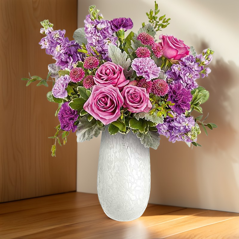 Presenting the Amelia Bouquet, a sophisticated arrangement of pink and lavender blooms artfully displayed in the Amelia Vase. This elegant art glass keepsake offers a subtle shimmer and a heartfelt sentiment, perfect for Mother's Day, anniversaries, or any celebratory occasion.