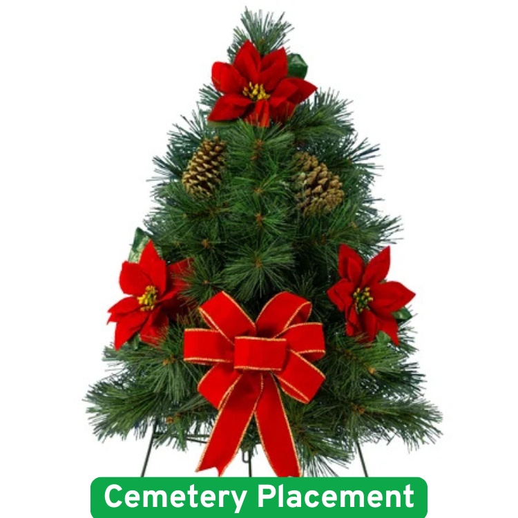 Features an evergreen Christmas tree with red poinsettias, decorative pine cones, and a red hand-tied bow. The bow is made up of 7 loops and 2 tails. Each tree is decorated by one of our designers and comes with a green, metal tripod easel that can be pushed into the ground. This is an artificial arrangement.