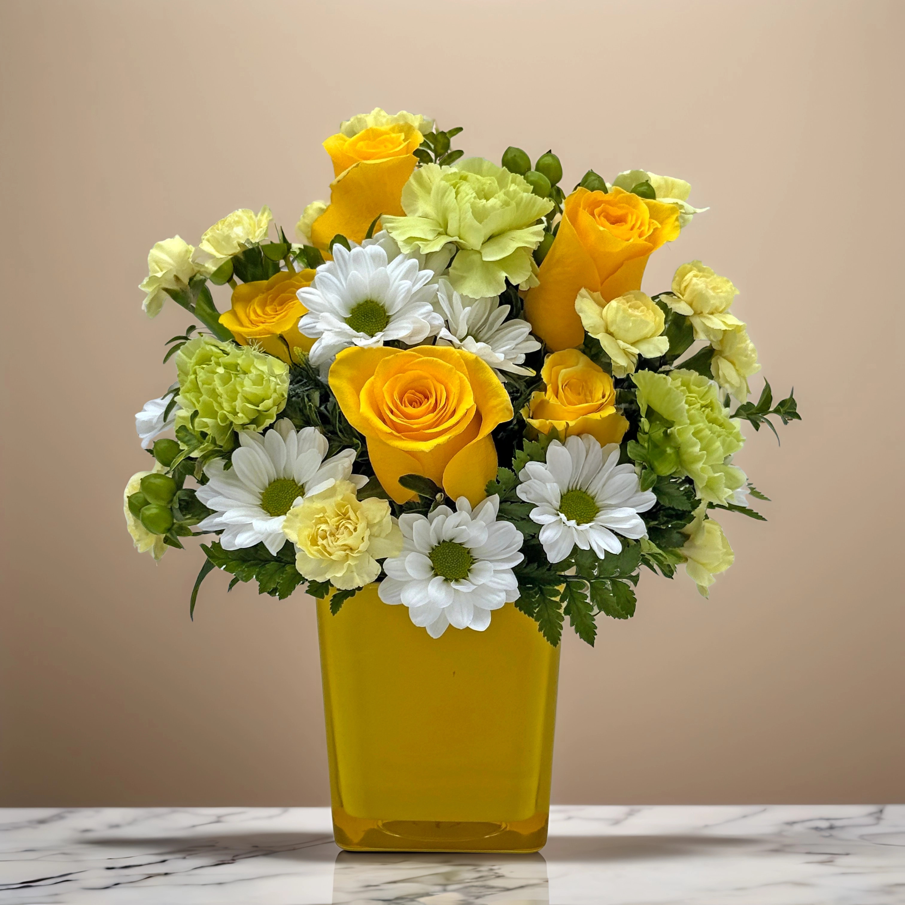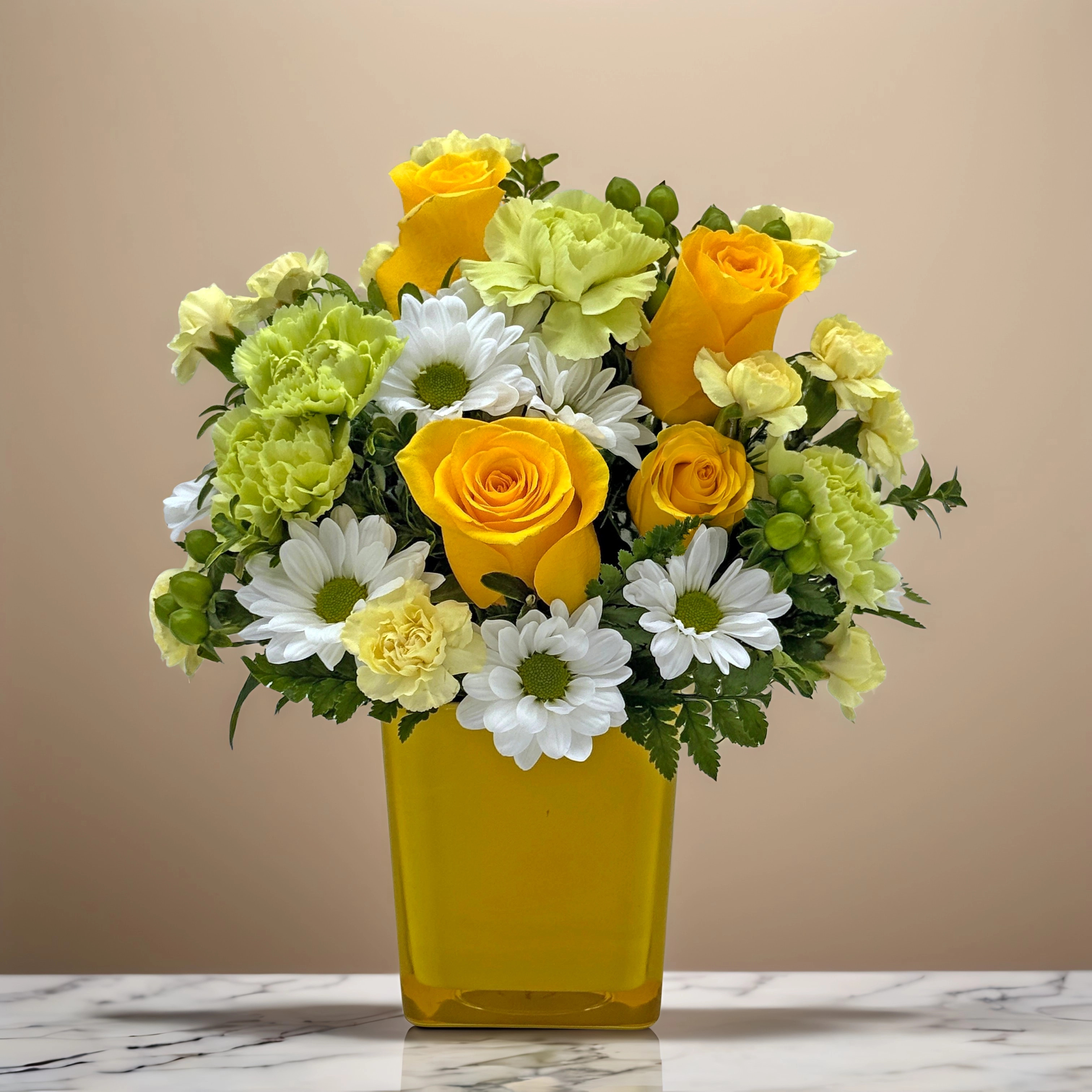 Bring a little sunshine indoors with our Bright Horizons Bouquet, a cheerful mix designed to lift the spirit and brighten any space. Brilliant yellow roses and soft green carnations are complemented by creamy spray carnations, crisp white daisies, and fresh accents of hypericum for a touch of texture. Hand-arranged in a sunny yellow glass vase, this bouquet radiates happiness and is perfect for birthdays, get-well wishes, or simply to say “thinking of you.”