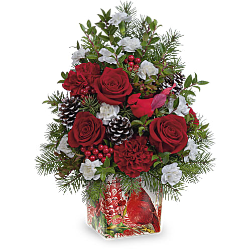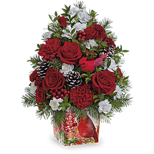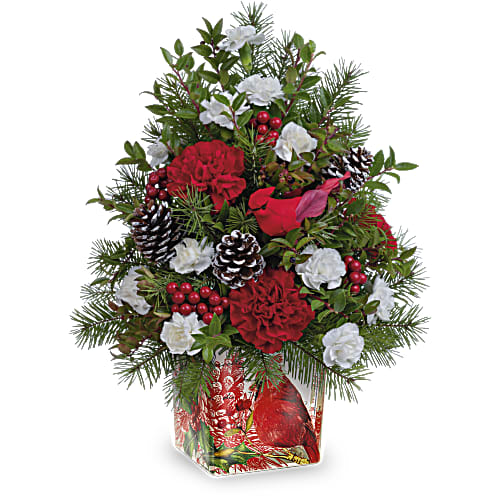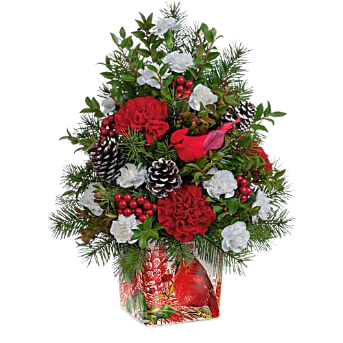 Wondrous winter whimsy for any Christmas celebration! This charming floral "tree" is presented in a winter cardinal cube vase that lives on as a vintage-inspired votive holder. This festive holiday arrangement features red carnations, miniature white carnations, red huckleberry and douglas fir. Teleflora's Cardinal In Flight Bouquet is delivered in Teleflora's Cardinal Cheer Cube.