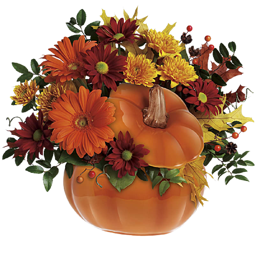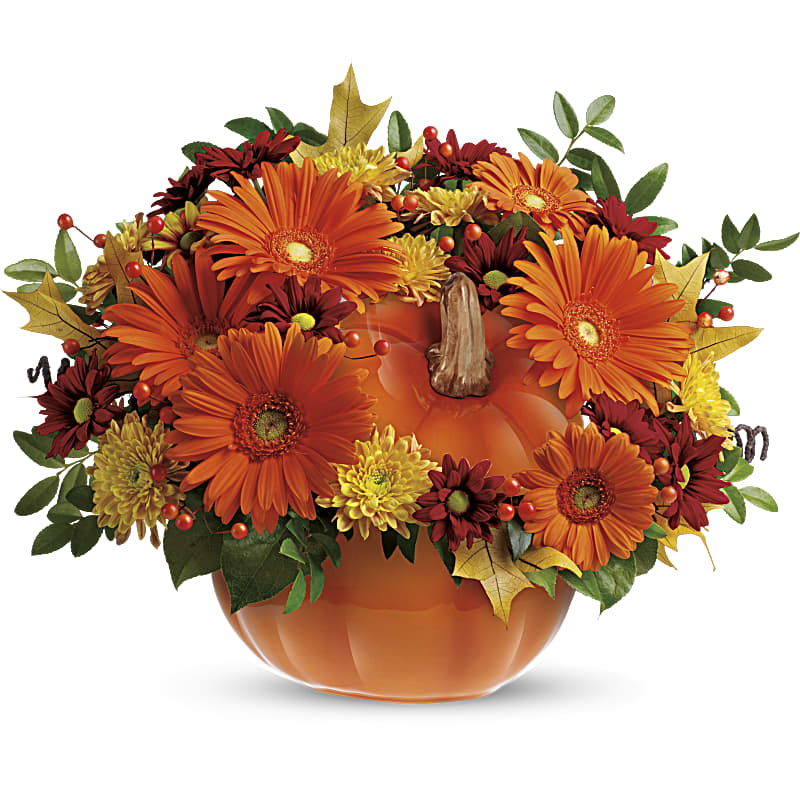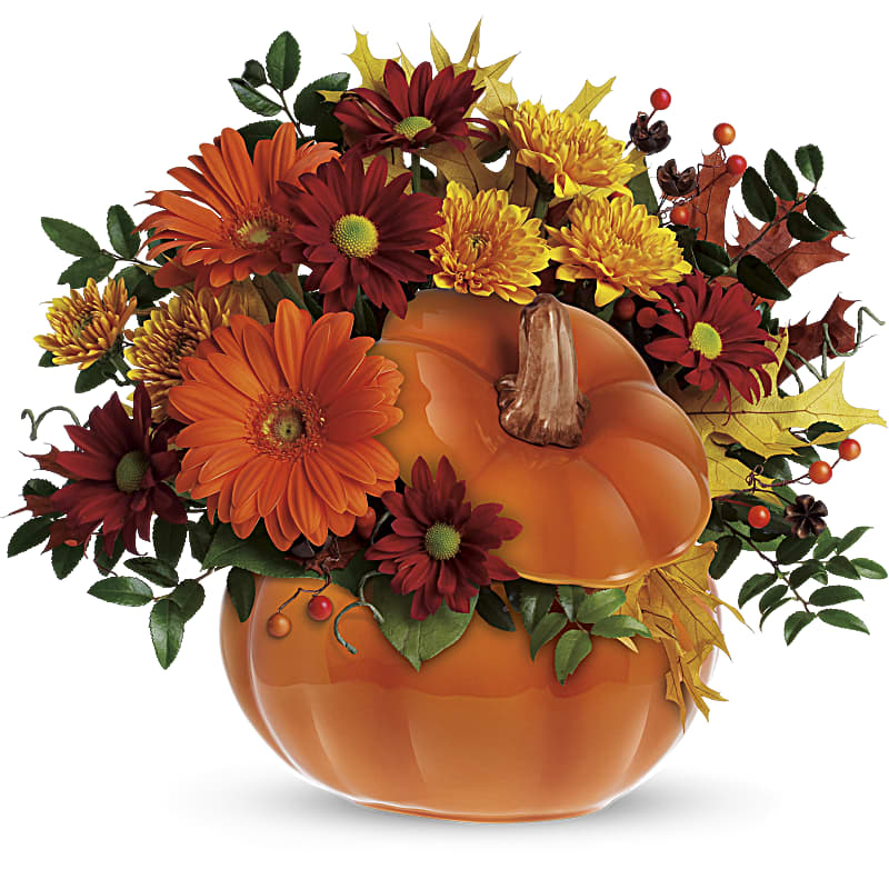 This pumpkin is sure to please! Send your special someone fall flowers and a keepsake gift with this reusable ceramic pumpkin arrangement. The fun Halloween decoration or spirited fall floral decoration for the home or office can later be used to serve Thanksgiving soup or stuffing!