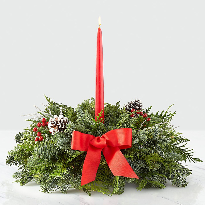 "Decking the halls" is one of the best parts of the holidays. Make your dining table look beautifully festive with a centerpiece handcrafted with fresh, fragrant Christmas greens, and accents of red berry clusters and a red bow. Light the red taper candle to create a warm glow as you celebrate the season with friends and family. To make it extra festive, we added a sparkly string of lights to help brighten your holiday.