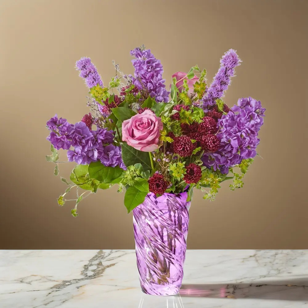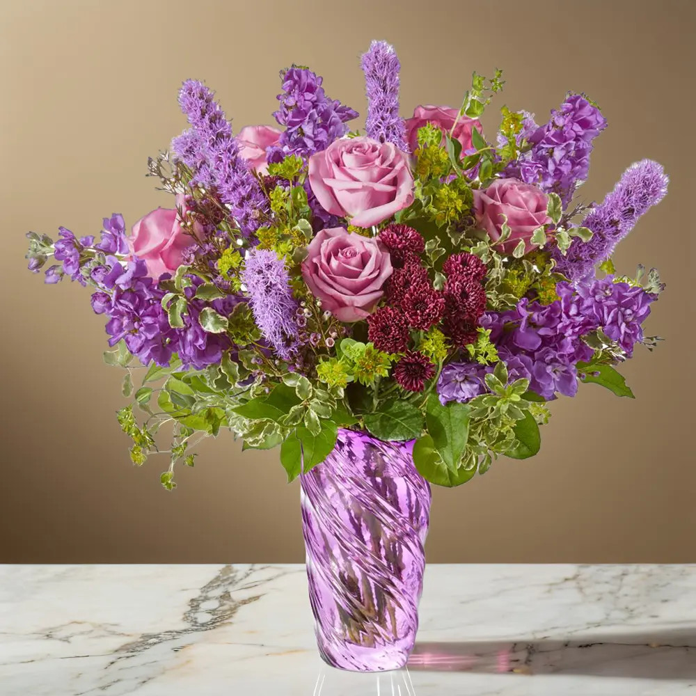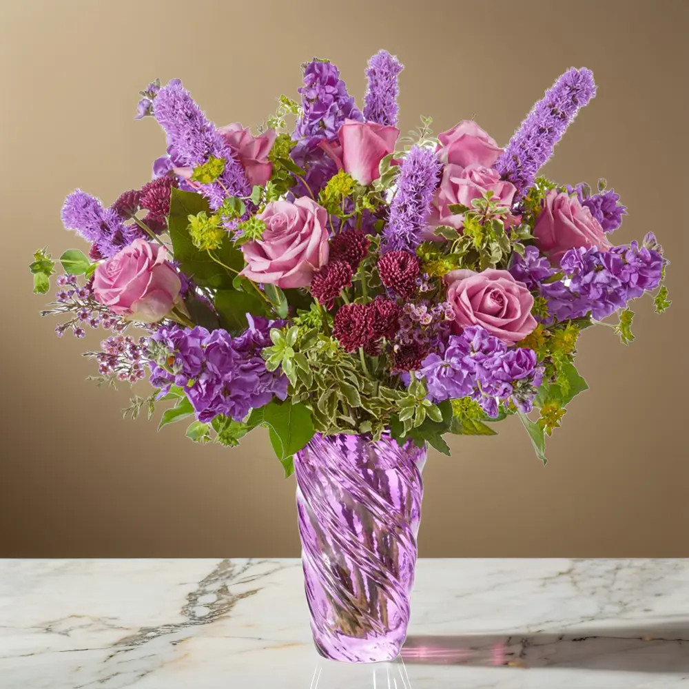 Crafting a truly enchanting floral arrangement, we present a dreamy blend of exquisite purple roses, delicate stock, vibrant liatris, and fragrant waxflower. These blooms are artfully complemented by the freshness of verdant greens, all exquisitely arranged within a sophisticated purple vase. The result is a captivating creation that evokes a soft, idyllic garden-inspired aesthetic, making it the perfect choice for celebrating cherished birthdays, commemorating memorable anniversaries, or expressing heartfelt appreciation through thoughtful thank-you gifts. Beyond these specific occasions, this floral masterpiece effortlessly introduces a touch of serene, tranquil beauty, elevating any setting and adding a calming presence to any day or event.