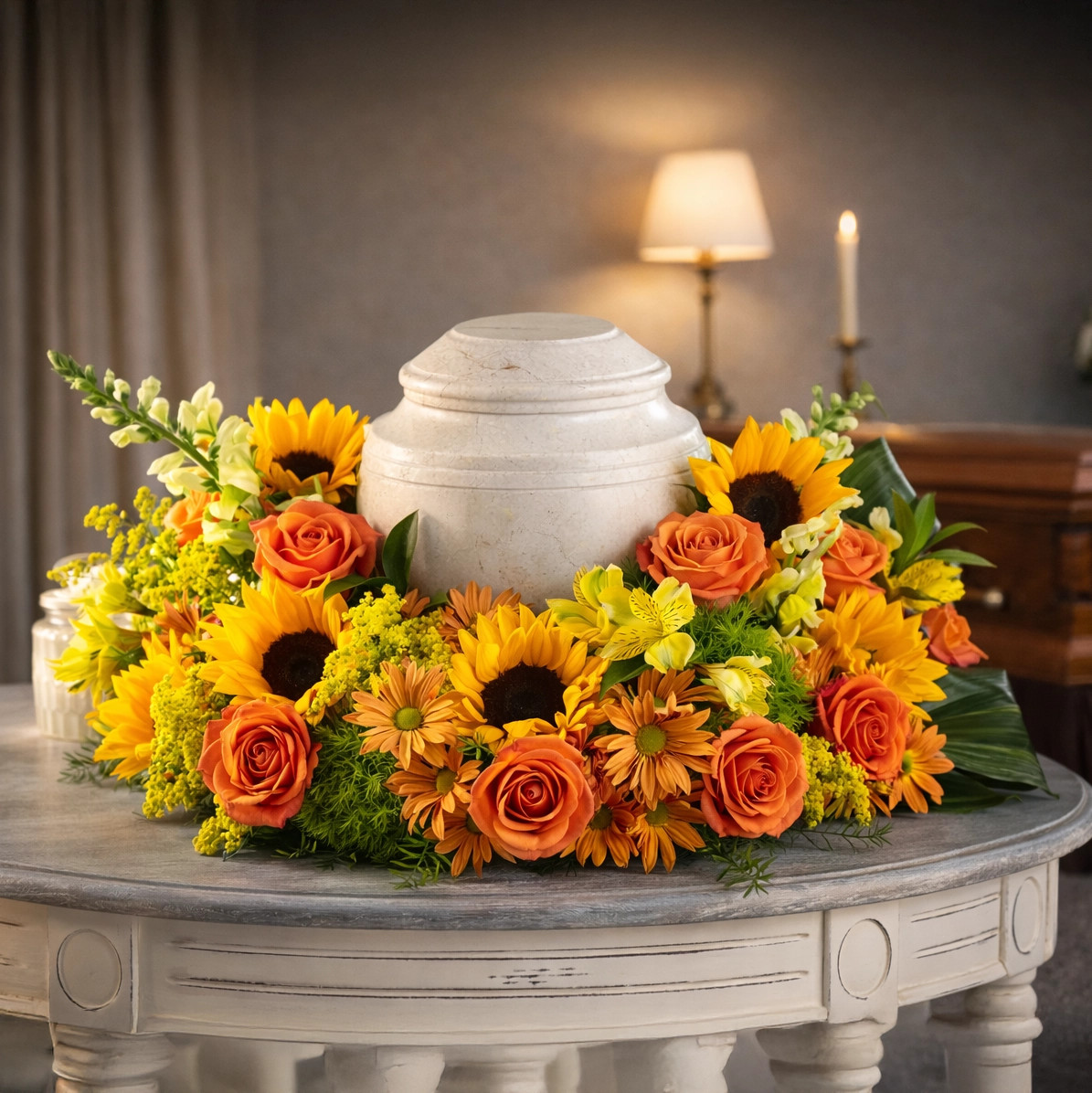 The Golden Sunflower Cremation Arrangement is a heartfelt floral tribute designed to surround an urn with warmth, beauty, and meaning. Featuring vibrant sunflowers accented with roses and complementary seasonal blooms, this arrangement conveys comfort, gratitude, and cherished memories.