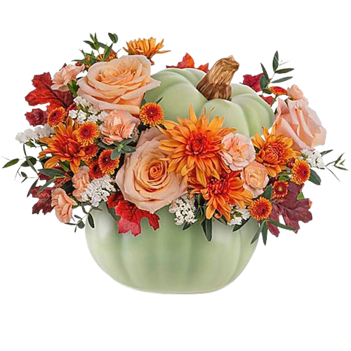 Brighten your fall gatherings with Teleflora's Harvest Magic Bouquet, featuring autumnal peach blooms. It's a stunning centerpiece that combines beauty with practicality in a gorgeous ceramic Sage Harvest pumpkin. Enjoy elegance with peach roses, mini peach carnations, bronze chrysanthemums, white sinuata statice, and parvifolia eucalyptus. Enhanced with rustic copper beech, dusty miller, and spiral eucalyptus, this arrangement is delivered in the Sage Harvest Pumpkin, perfect for adding a touch of fall charm to your home.