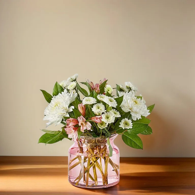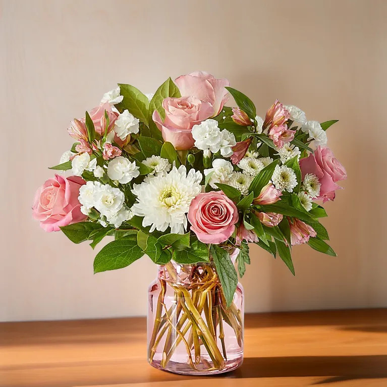 Infatuated Bouquet is a soft, romantic arrangement designed to express admiration, affection, and heartfelt emotion. Blush roses take center stage, surrounded by crisp white blooms and lush greenery for a look that feels fresh, elegant, and effortlessly charming. Arranged in a modern glass cylinder vase with a subtle pink tint, this bouquet is perfect for anniversaries, romantic gestures, or simply letting someone know they’re on your mind. Its balanced design and gentle color palette make it a beautiful choice for both everyday moments and meaningful occasions.