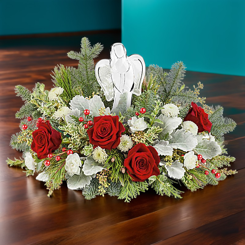 Bring peace and beauty to the holiday season with the Joy To The World Bouquet. Featuring radiant red roses, delicate white blooms, fresh evergreens, and festive red berries, this centerpiece is accented with a graceful glass angel keepsake. A meaningful gift for Christmas gatherings or as a heartfelt tribute, it’s designed to inspire warmth, hope, and joy throughout the season.
