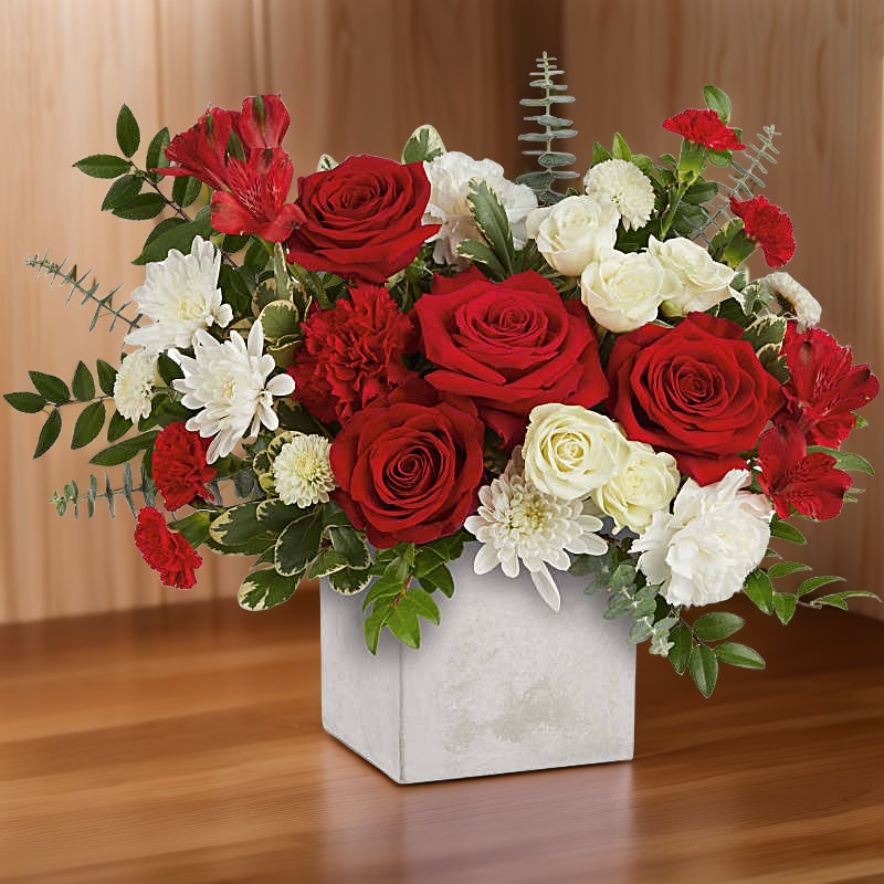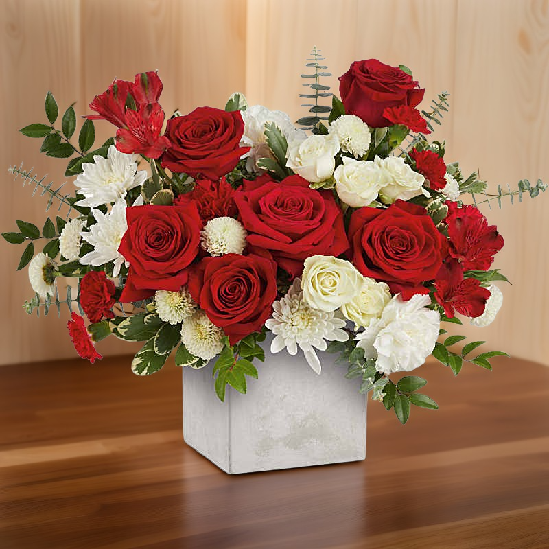 A bold expression of affection, the Love Me Bouquet combines classic red and white blooms within a sleek, concrete-inspired cube, creating a look that is both romantic and contemporary.