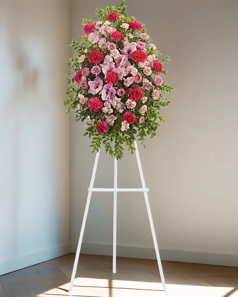 To send sympathy flowers is a testament of your love and devotion. This feminine standing spray is a pink garden of alstroemeria, gladioli, carnations and asters.