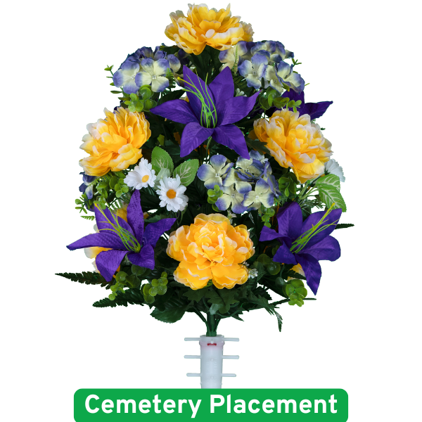 Product Description Vibrant yellow roses and cool blue hydrangeas, highlighted by bold purple lilies and delicate white daisies. This artificial arrangement is specially crafted for cemetery placements, ensuring lasting beauty and a warm tribute. Reviews products.reviews.no_reviews