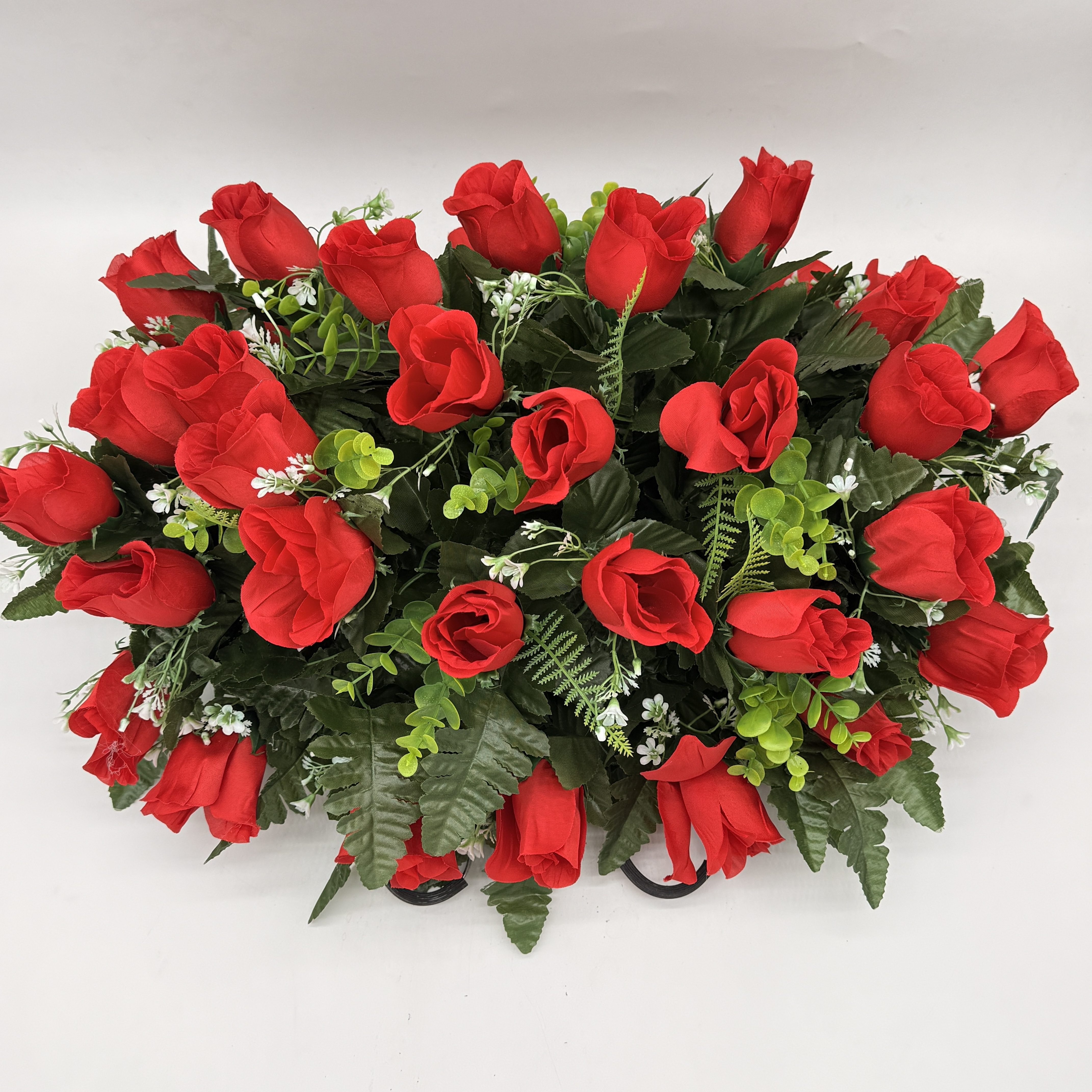 A stunning flower blanket crafted with rich red rose buds. The blanket is accented with lush fern and features 36 vibrant red rose blooms, perfect for honoring your Loved One. This arrangement is both eye-catching and realistic, capturing the charm and beauty of fresh flowers in a durable and long-lasting form.