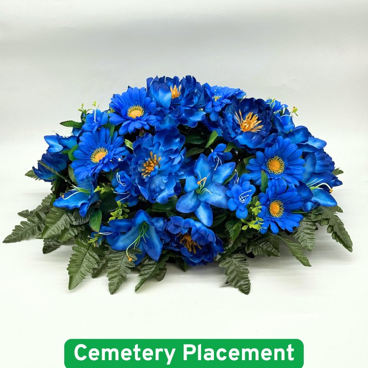 A stunning flower blanket crafted with royal blue peonies, lilies, and daisies. This arrangement is both eye-catching and realistic, capturing the charm and beauty of fresh flowers in a durable and long-lasting form.