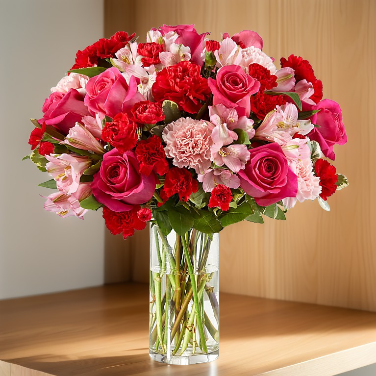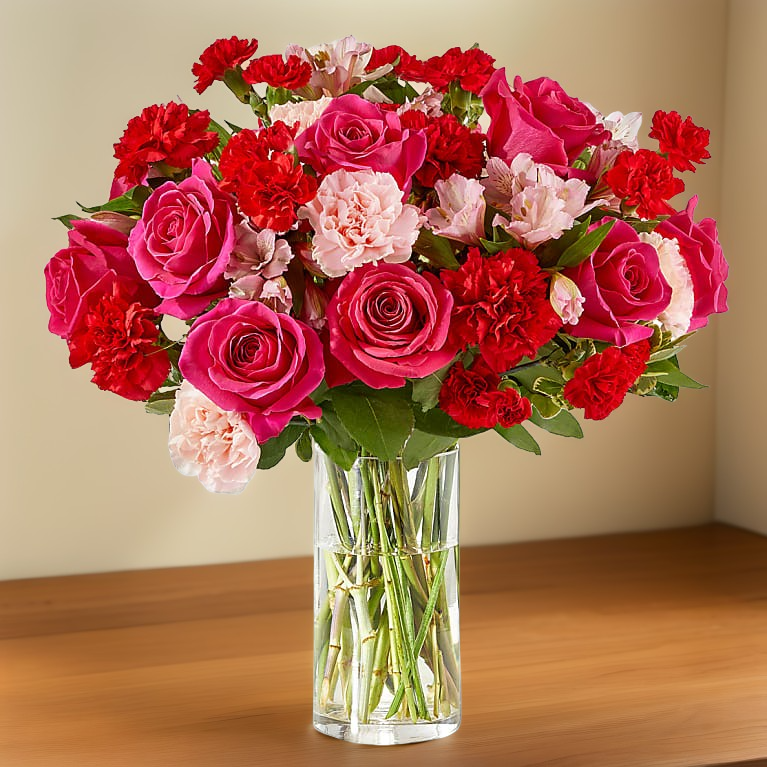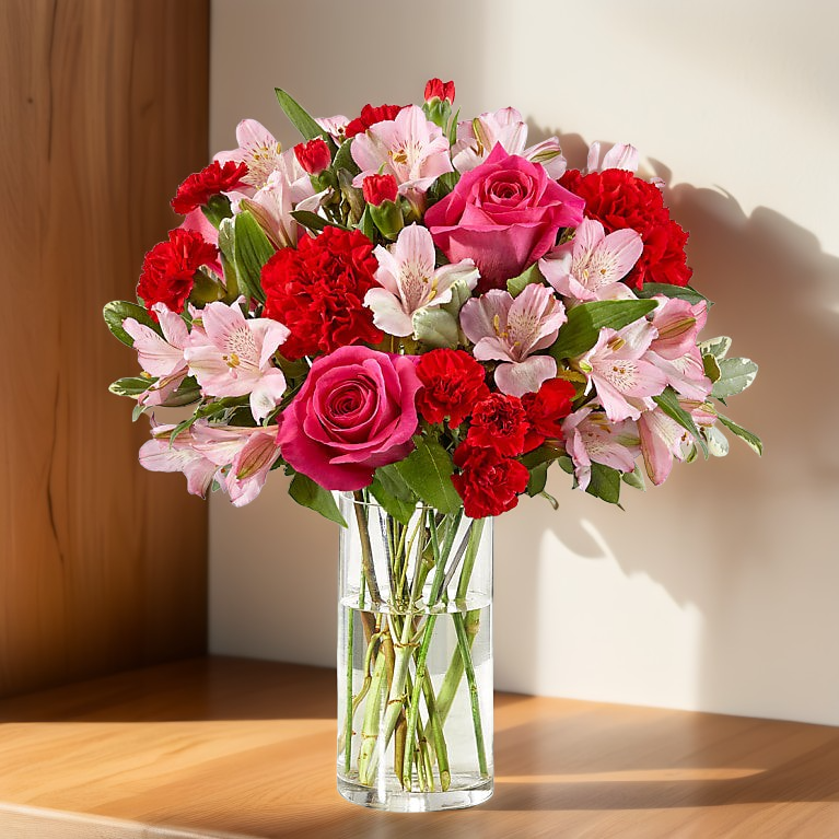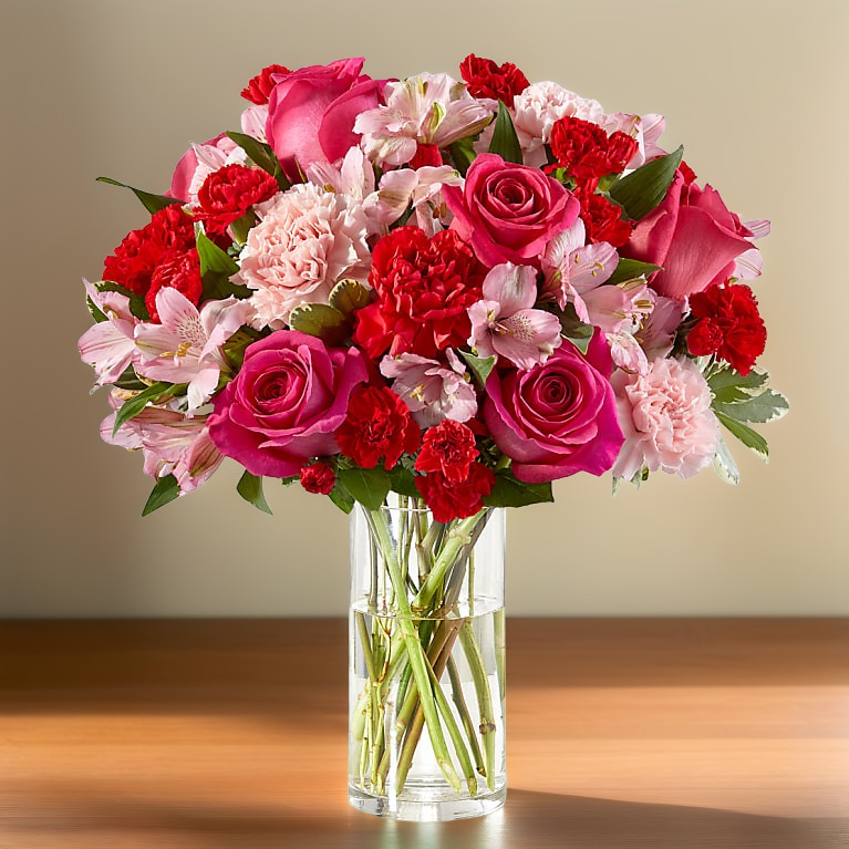 Handcrafted and inspired by the gorgeous hues of the season, the You're Precious™ Bouquet is full of sweet sentiment for your favorite person. Hot pink roses, red carnations, pink alstroemeria, and pale pink carnations come together in a clear glass vase to make any room feel beautiful and light. From special birthdays to simply just because, this arrangement is a stunning gift to give your loved ones for every occasion.
