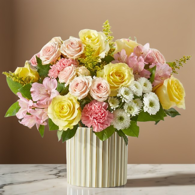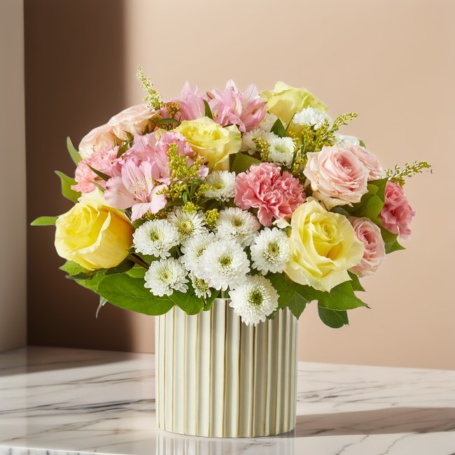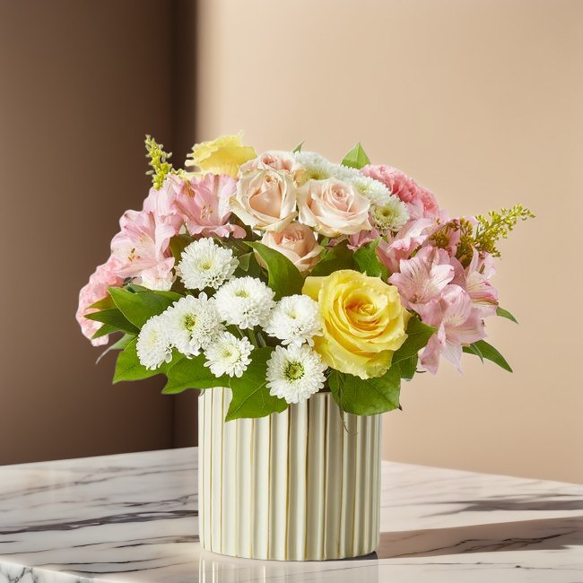 Arranged in a modern fluted ceramic vase, this design brings warmth and charm to any space. Its light, airy palette makes it perfect for birthdays, congratulations, new baby celebrations, thank you gifts, or simply brightening someone’s day.